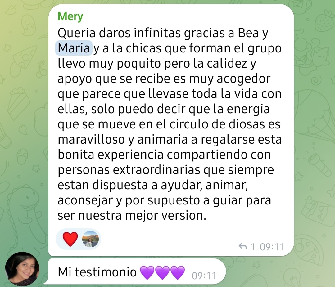 Acceso a un grupo privado de Telegram 24/7 donde podrás conectar con otras mujeres en el mismo camino que tú.