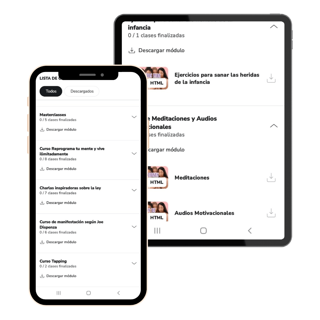 Acceso inmediato a cursos poderosos sobre manifestación consciente, reprogramación mental, energía femenina, sanación de heridas emocionales, relaciones expansivas, ley de atracción, ley de asunción y más.